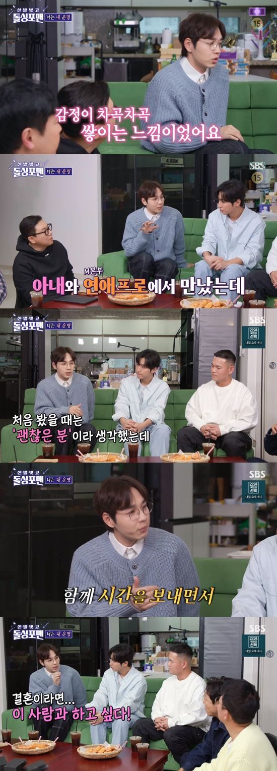 이어 "아내가 들어오자 빛이 이렇게 열리더니 '문이 열리네요' 노래가 들리더라. 그렇게 첫눈에 반했다"고 고백했다.