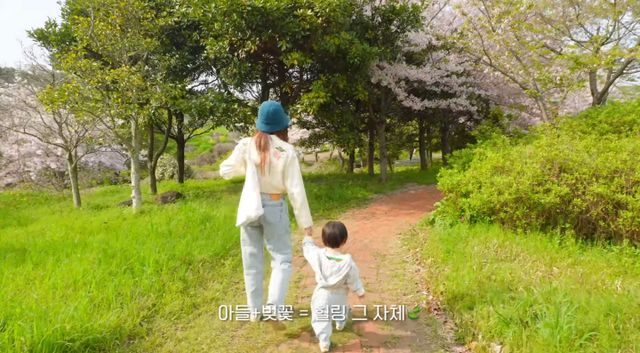 박한별은 아들의 손을 꼭 잡은 채 벚꽃 나무 아래를 걸었다.