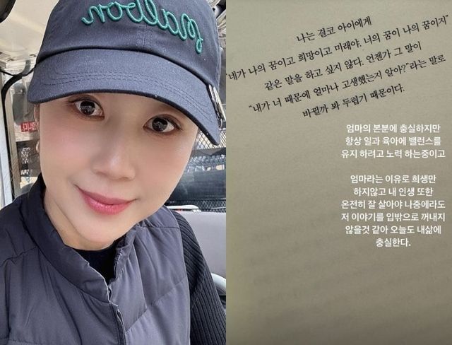 그러면서 "엄마라는 이유로 희생만 하지 않고 내 인생 또한 온전히 잘 살아야 나중에라도 저 이야기를 입 밖으로 꺼내지 않을 것 같아 오늘도 내 삶에 충실한다"고 덧붙였다.