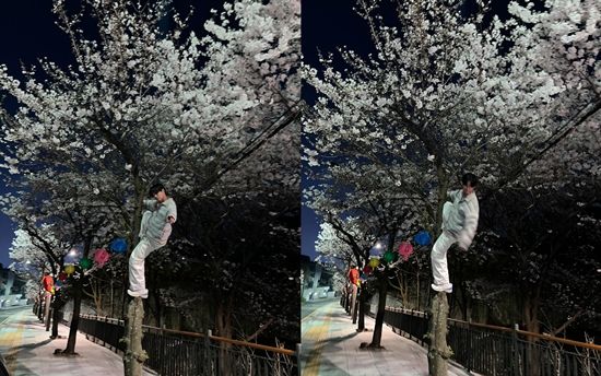 사진에는 단순히 벚꽃 구경에 나선 것이 아닌 포즈까지 취하면서 벚나무 위에 올라간 최성준의 모습이 담겼다.