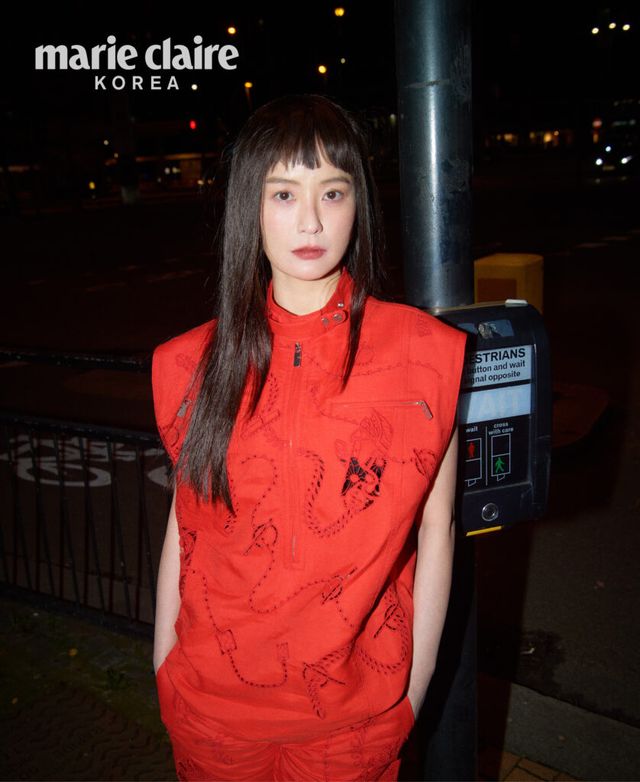 체인 모티프를 브로더리 앙글레이즈 기법으로 수놓은 슬리브리스 톱과 팬츠 모두