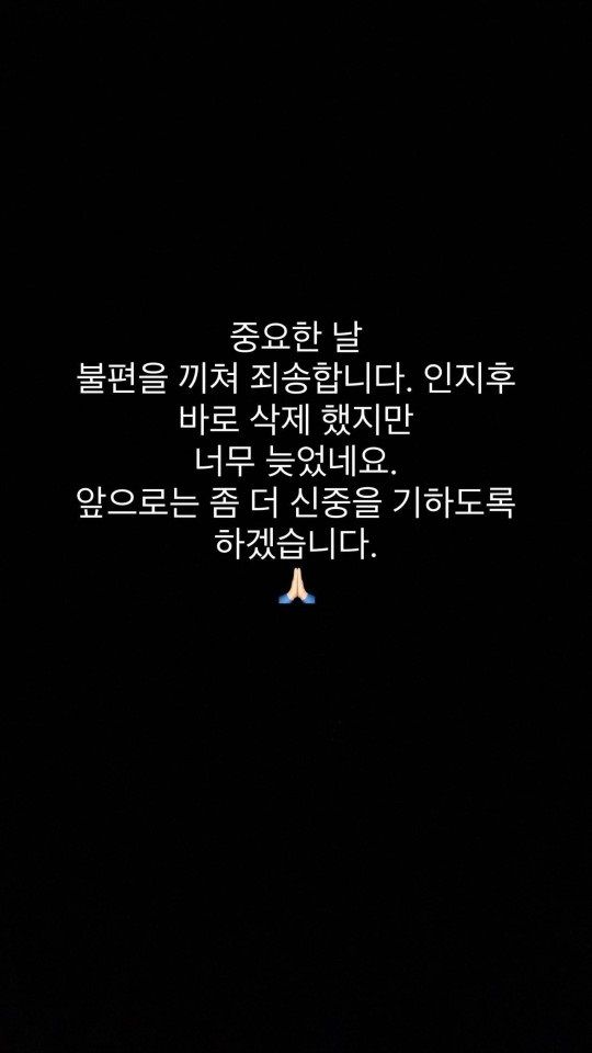 결국 고소영은 다음날인 16일 "중요한 날 불편을 끼쳐 죄송하다. 인지 후 바로 삭제했지만 너무 늦었다. 앞으로는 좀 더 신중을 기하도록 하겠다"라며 사과문을 올렸다.