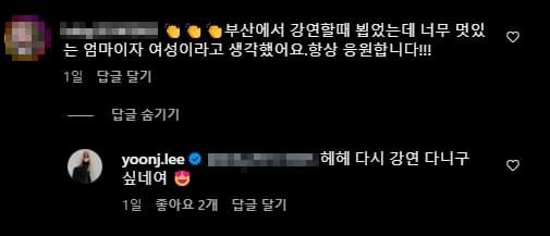 해당 게시물의 댓글 중 "응원한다"라는 팬의 말에 이윤진은 "다시 강연 다니고 싶다"라는 바람을 내비치기도 했습니다.