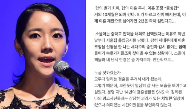 이어 "소을이는 중학교 진학을 해외로 선택했다는 이유로 작년 말부터 서울집 출입금지를 당했다. 감히 세대주에게 이혼조정을 신청한 저는 세대주의 승인과 감시 없이는 집에 들어가 속옷가지들조차 찾아올 수 없는 상황"이라고 전해 모두를 충격에 빠뜨렸습니다.