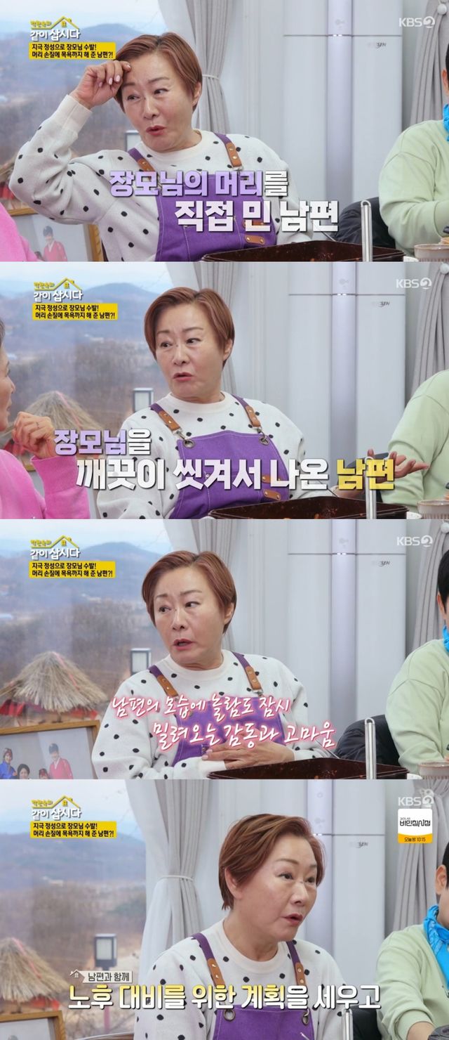 계속해서 그는 어머니를 씻기기 힘들었을 때 남편이 나서서 타월을 깔고 어머니를 깨끗이 씻겨서 나왔던 일화를 풀었다.