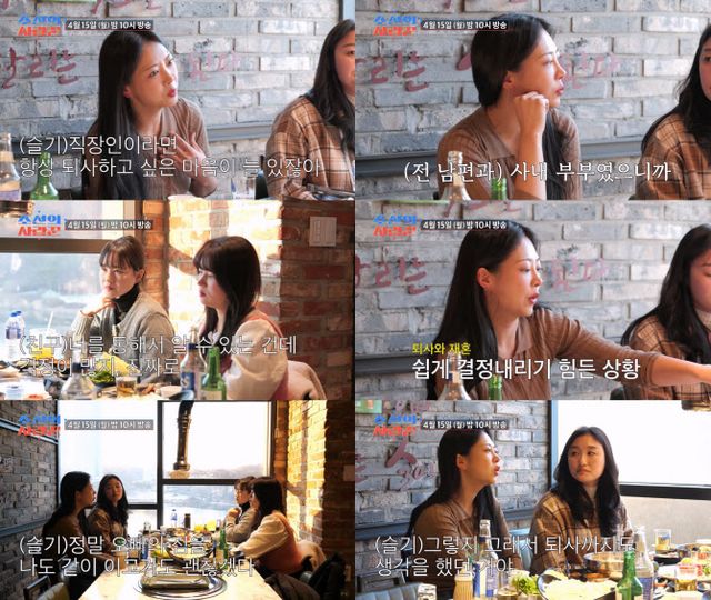 14일 방송되는 ‘조선의 사랑꾼’에서는 파주와 청주를 오가는 장거리 돌싱커플 김슬기 유현철의 이야기가 담긴다. 11일 공개된 비하인드 영상에서 김슬기는 17년 지기 회사 언니들과 함께 즐거운 식사 자리를 가졌다. 슬기의 지인들은 “지금 퇴사를 생각하는 단계냐”라고 물었다. 그러자 김슬기는 “집이 파주랑 청주라 너무 머니까 처음에는 퇴사를 무조건 적으로 생각했다. 또 직장인이라면 항상 퇴사하고 싶은 마음도 있으니까”라며 퇴사에 마음이 있었음을 밝혔다.