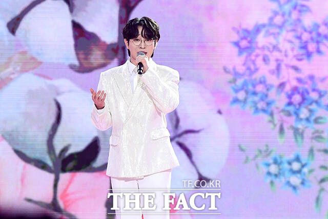 가수 안성훈이 12일 오후 서울 마포구 SBS프리즘타워에서 열린 '트롯 뮤직 어워즈 2024' 시상식에 참석해 '엄마꽃' 무대를 펼치고 있다. /서예원 기자