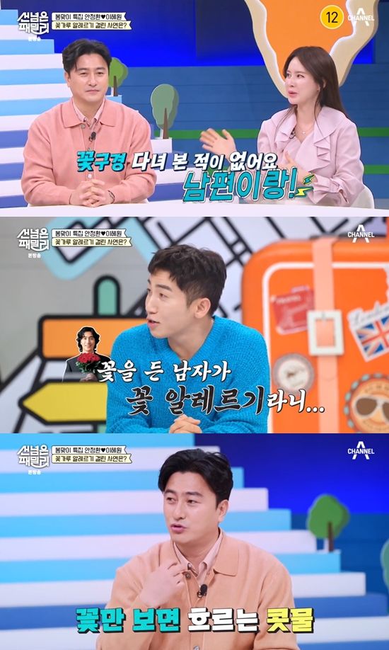 송진우가 "항상 집에서 콧물을 흘리고 지낸다고 들었다. 꽃과 함께 살아서"라고 재치를 발휘하자, 안정환은 "눈물 콧물 다 흘린다"고 수긍했다.