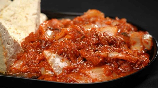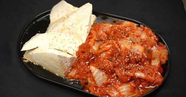 끝으로 그릇에 데친 두부를 꺼내 썰어 담고, 4의 볶음김치를 함께 플레이팅한다. 들기름과 통깨를 뿌려 맛있게 먹으면 된다.