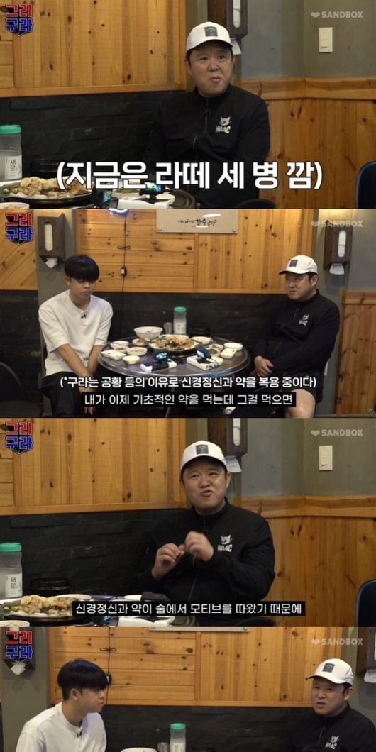 김구라는 “집안의 우환으로 신경정신과 약을 먹는데 그 약이 술에서 모티브를 따왔기 때문에 술을 약간 먹은 효과를 뇌에 준다. 세로토닌 분비를 원활하게 해준다. 신경정신과 약을 먹는 사람이 술을 마시면 다음 날 너무 힘들다. 엄청나게 몸이 힘들다. 그래서 술을 끊게 되는 거다”며 “난 그것 때문은 아니고 일도 너무 많았다. 그리고 또 옛날에는 내가 일이 있으면 전날은 절대로 술을 안 마셨다. 그래서 30년을 버틴 것”이라고 했다. 이에 아들 그리는 “철저하다”며 존경심을 드러냈다.
