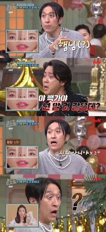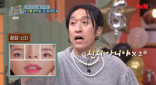 코요태 신지의 눈, 코, 입 사진이 뜨자 게스트들은 "나 알겠다", "바로 보인다"라며 정답을 곧바로 눈치챘다.