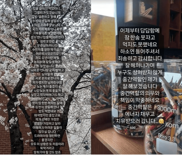 그러면서 "저는 출연도 하지 않았는데 부녀의 친밀하지 못함이 중간역할을 못한 제 탓으로 돌아오니 마음이 무겁다"고 말한 장정윤은 "답답함에 잠 한숨 못 자고 먹지도 못했다. 하소연 들어줘서 감사하다. 누구도 상처받지 않게 중간 역할인 제가 잘 해보겠다"고 설명을 마쳤습니다.