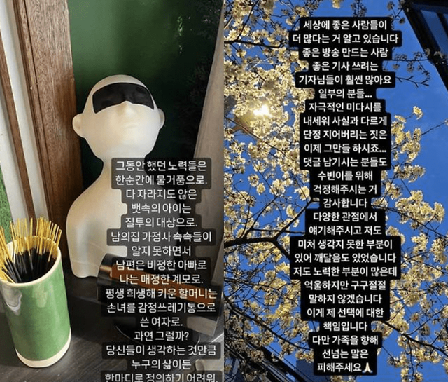 이어 장정윤은 "수빈이를 걱정해주시는 것 감사하다. 저도 노력한 부분 많은데 억울하지만 구구절절 말하지 않겠다. 이게 제 선택에 대한 책임"이라면서도 "다만 가족을 향해 선넘는 말은 피해달라"고 당부를 하기도 했습니다.