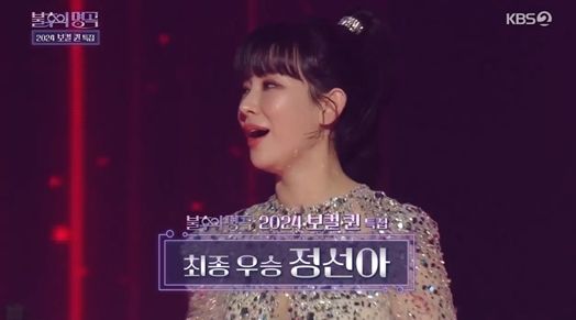 '불후의 명곡' 정선아가 4연승을 달려온 김연지를 꺾고 불꽃 튀는 대결의 최종 우승을 차지했다. 정선아는 트로피를 건네받으며 밝은 미소로 승리의 기쁨과 영광을 만끽했다.
