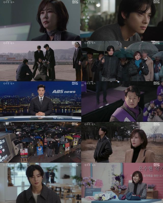 지난 13일 ‘원더풀 월드’ 14회에서는 수현(김남주 분)과 선율(차은우 분)을 주축으로 모든 사람들이 힘을 모아 김준(박혁권 분)의 온갖 악행들을 고발하며 소위 ‘김준 게이트’를 오픈 하는 모습이 그려졌다. 앞서 수현의 기습적인 폭로로 궁지에 몰린 김준은 수현이 지웅(오만석 분)을 죽이던 날의 대화가 담긴 녹음을 일부러 세상에 공개, 자식의 죽음으로 인해 이성을 잃은 엄마의 비상식적 주장인 것처럼 여론을 호도하며 건우(이준 분)의 살인 교사 혐의를 전면 부인했다. 하지만 수현은 포기하지 않고 김준을 처벌해달라는 1인 시위에 나서 맞서 싸웠고, 선율을 비롯해 그 동안 수현에게 도움을 받았던 수많은 사람들이 시위에 힘을 보태 감동을 자아냈다.