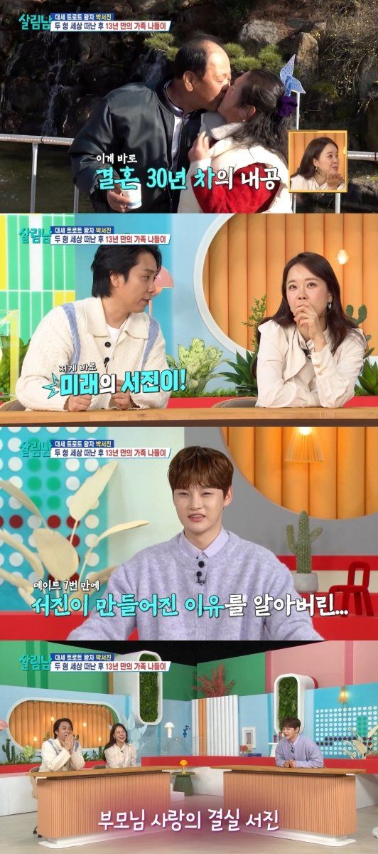 같은 시각 박서진의 부모님은 단둘만의 데이트 시간을 갖게 됐고, 오붓한 분위기를 만끽하며 커플 사진을 찍었다. 이때 박서진의 아버지는 아내에게 박력 넘치는 뽀뽀를 해 스튜디오를 후끈 달아오르게 했다. 스튜디오에서 부모님의 스킨십 장면을 마주한 박서진은 크게 당황하며 말을 잇지 못했다.