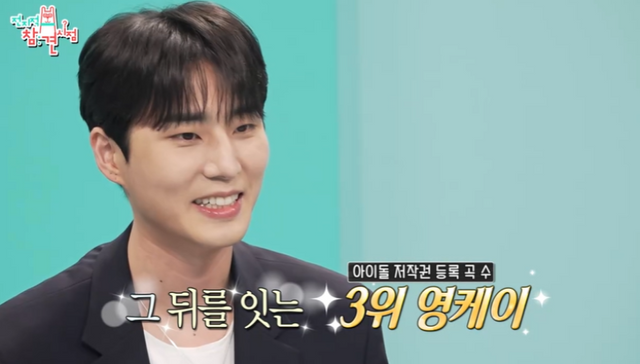 이어 송은이가 “이번 앨범에서도 몇 개를 썼냐”고 묻자 영케이는 “이번에도 전곡 작사작곡”이라며 “아마 (저작권료 등수는) 개수로 정해지는 거 같다. 데뷔 때부터 지금까지 전곡 작사작곡을 하다 보니 그런 것 같다”고 겸손하게 답했다.
