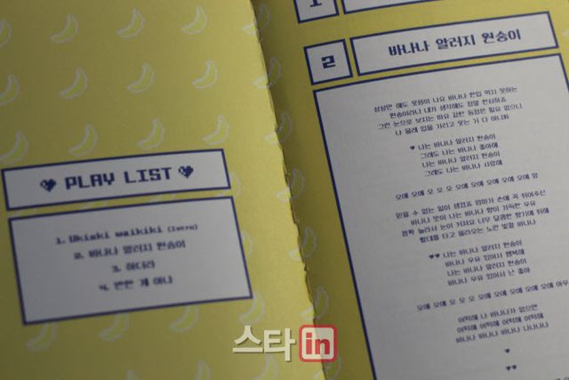 앨범에는 총 4개의 트랙이 수록돼 있습니다. 일단 앨범과 동명의 타이틀곡인 2번 트랙 ‘바나나 알러지 원숭이’를 효정, 비니, 아린이 불렀고요. 수록곡 중 3번 트랙 ‘하더라’를 나머지 멤버인 미미, 유아, 승희, 지호가 가창했고, 4번 트랙인 ‘반한 게 아냐’를 승희가 홀로 불렀습니다. 1번 트랙 ‘우키우키 와이키키’(Ukiuki waikiki)는 앨범의 정체성을 표현한 인트로 트랙입니다.