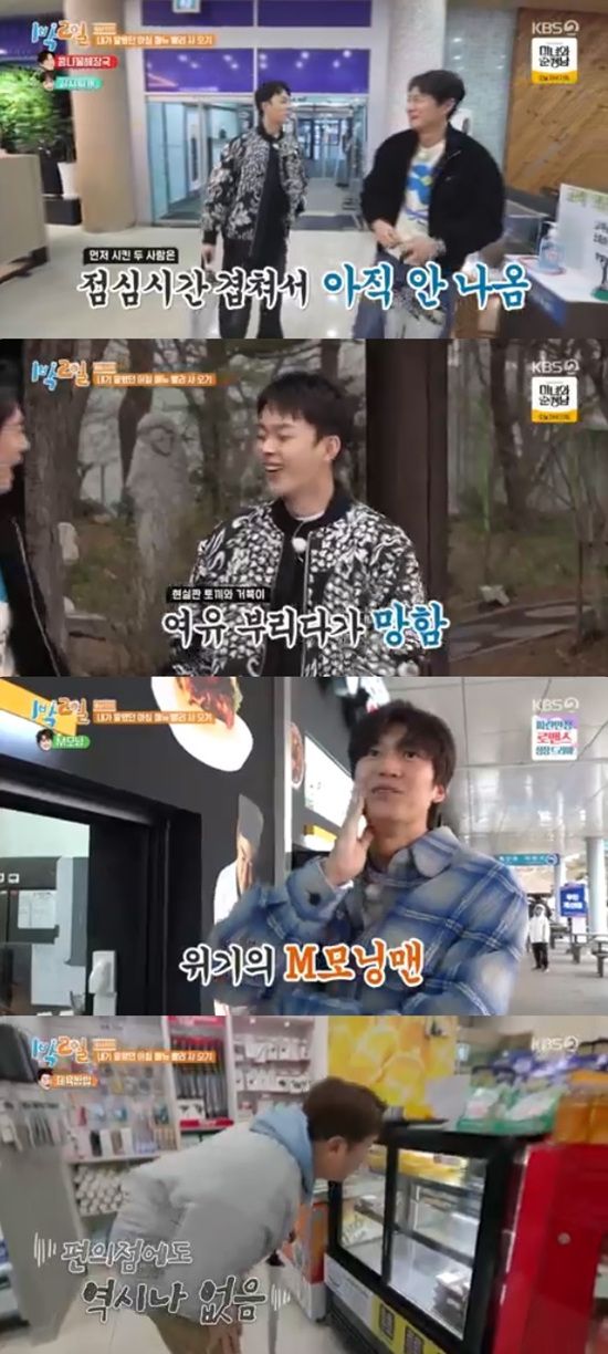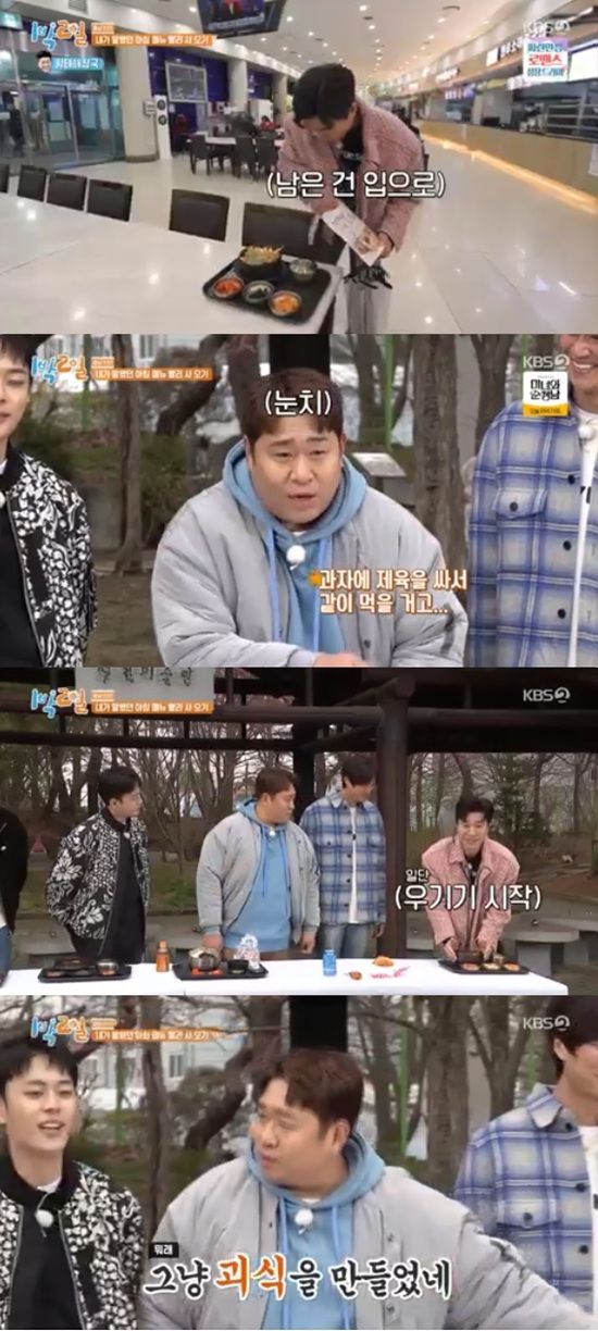 딘딘은 가장 먼저 샌드위치 사서 1등으로 돌아왔다. 연정훈과 유선호는 나란히 콩나물 해장국과 김치찌개를 주문해 놓고 기다렸다.