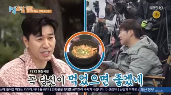 김종민은 이정규PD가 제작진이 음식을 대신 먹는다고 하자 "그건 정규리가 먹었으면 좋겠다"면서 자신이 만든 황태해장국을 메인PD에게 먹이려고 했다.