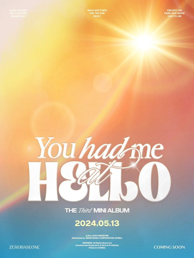 제로베이스원은 오는 5월 13일 미니 3집 ‘유 해드 미 앳 헬로우’를 발매한다. 지난해 11월 미니 2집 ‘멜팅 포인트’ 발매 이후 약 6개월 만의 컴백이다. 본격 컴백에 앞서 스포일러 필름과 컴백 포스터 등을 통해 청량함에 녹아든 강렬한 태양빛을 연상케 하는 뜨거운 여름 콘셉트가 예고되며 팬들의 기대감을 높이고 있다.