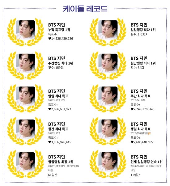 지민은 이외에도 다양한 투표에서 존재감을 과시하고 있다. 그는 일일 최다 득표, 생일 최다 득표 등 명예의 전당 10개 부문을 석권했다. 그의 누적 득표량은 145억 2,642만 9,926표에 이른다.