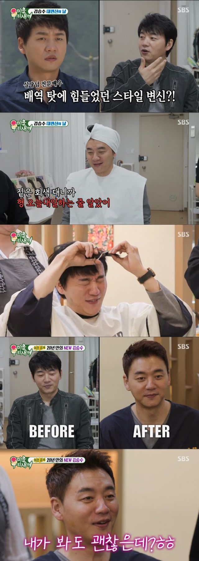이어 김승수는 헤어스타일 변신에도 도전했다. 이상민은 “형 머리 스타일 바꾸고 아까처럼 밝은 톤으로 옷 입으면 올해 안에 장가간다”라며 김승수를 설득했다. 드디어 안대를 벗고 변신한 자신의 모습을 본 김승수는 만족했고, 스튜디오의 MC들 모두 반쯤 기립한 채 물개 박수로 김승수의 변신을 칭찬했다. 이 장면은 최고 13%까지 올라 ‘최고의 1분’을 기록했다.