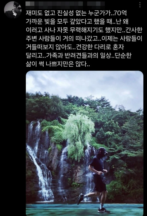 이어 "간사한 주변 사람들이 거의 떠나갔고 이제는 사람들이 거들떠보지 않아도 건강한 다리로 혼자 달리고 가족과 반려견들과의 일상. 단순한 삶이 썩 나쁘지만은 않다"고 덧붙였습니다.