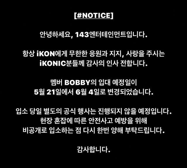 아이콘 소속사 143엔터테인먼트는 공식 채널을 통해 "바비의 입대 예정일이 5월 21일에서 6월 4일로 변경됐다"고 공지했다.