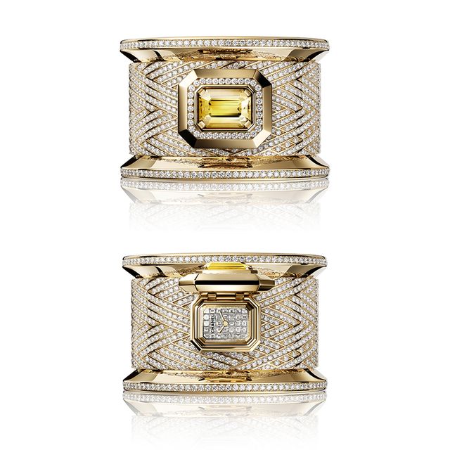 에메랄드 컷 옐로 사파이어 아래에 다이아몬드로 세팅한 다이얼이 숨겨진 ‘보빈 커프 꾸뛰르(Bobbin Cuff Couture)’, 가브리엘 샤넬의 옆모습을 표현한 버튼 아래 블랙 래커 다이얼이 숨겨진 ‘마드모아젤 프리베 부통 가브리엘 워치(Mademoiselle Prive Bouton Gabrielle Watch)’, 더블 레더 스트랩에 줄자 모티프를 프린트하고 티타늄과 18K 옐로 골드 소재 케이스에 샤넬 여사 피규어 참으로 장식한 ‘프리미에르 루반 꾸뛰르 워치(Premiere Ruban Couture Watch)’, 아이코닉한 샤넬 트위드 재킷 패턴을 다이얼에 더한 ‘보이·프렌드 꾸뛰르 워치(Boy·Friend Couture Watch)’ 등 샤넬만의 꾸뛰르적 터치가 더해진 꾸뛰르 어클락 컬렉션의 다채로운 워치의 향연이 펼쳐졌습니다.