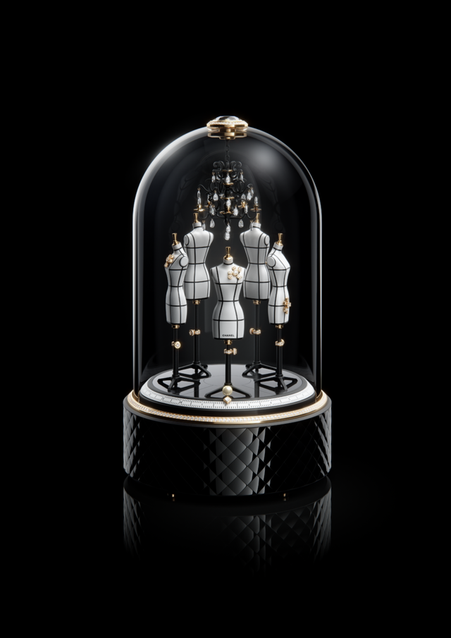 샤넬 워치메이킹 크리에이션 스튜디오는 깡봉가 아틀리에의 활기찬 분위기에서 영감을 얻어, 가브리엘 샤넬(Gabrielle Chanel)이 흥얼거리곤 했던 알 보울리(Al Bowlly)의 ‘마이 우먼(My Woman)’의 리듬에 마치 마네킹이 춤추는듯한 형태인 ‘뮤지컬 클락 꾸뛰르 워크샵(Musical Clock Couture Workshop)’을 선보였습니다. 뮤직 박스, 시계, 오토마톤을 모두 담아낸 이 특별한 작품은 다수의 숙련된 장인들의 손길을 거쳐 다이아몬드 장식 미니어처 샹들리에에서부터 세밀하게 조율된 음악 장치, 그리고 기계 장치를 감을 수 있는 다이아몬드 장식의 체인 네크리스까지 정교한 기술과 미학으로 완성된 단 하나의 유니크 피스죠.