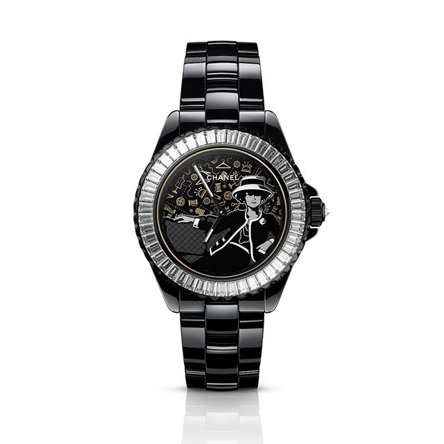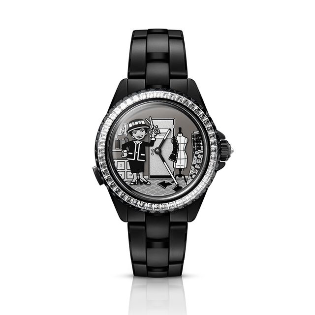 샤넬 여사의 피규어, 가위, 그리고 가봉용 마네킹이 생동감 넘치게 움직이는 ‘J12 꾸뛰르 워크샵 오토마톤 칼리버 6(J12 Couture Workshop Automaton Caliber 6)’는 꾸뛰르 아틀리에에서 영감을 얻어 위트를 더한 새로운 J12 워치입니다. 샤넬의 스위스 매뉴팩처에서 디자인하고 제작한 새로운 무브먼트 칼리버 6를 탑재했으며, 355 개의 부품을 사용해 버튼 하나만 누르면 샤넬 여사 피규어가 살아 움직이는 듯 연출할 수 있습니다. 전면의 48개의 다이아몬드가 세팅된 블랙 컬러의 베젤과 매트 블랙 세라믹 브레이슬릿이 어우러져 더욱 고급스러움을 자아냅니다. 더불어 블랙 앤 화이트 수트를 입은 샤넬 여사의 실루엣을 담은 다이얼이 돋보이는 ‘마드모아젤 J12 꾸뛰르(Mademoiselle J12 Couture)’도 함께 선보였습니다. 이 역시 베젤에는 바게트 컷 다이아몬드를, 그리고 셀프 와인딩 칼리버 12.1 무브먼트를 탑재했습니다.