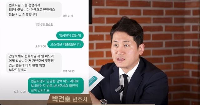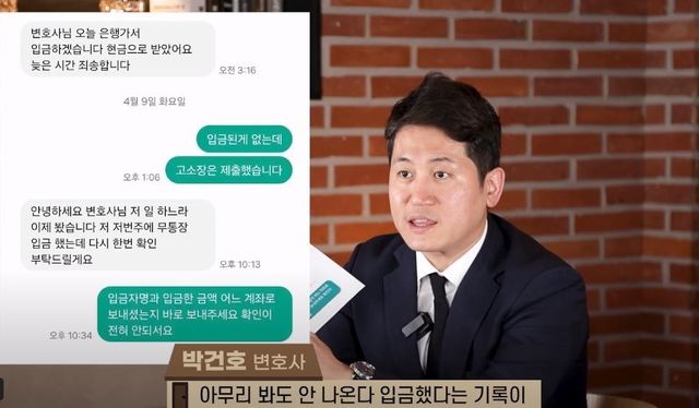문자에는 "변호사님 오늘 은행 가서 입금하겠다. 현금으로 받았다. 늦은 시간 죄송하다"라고 쓰여 있었다.