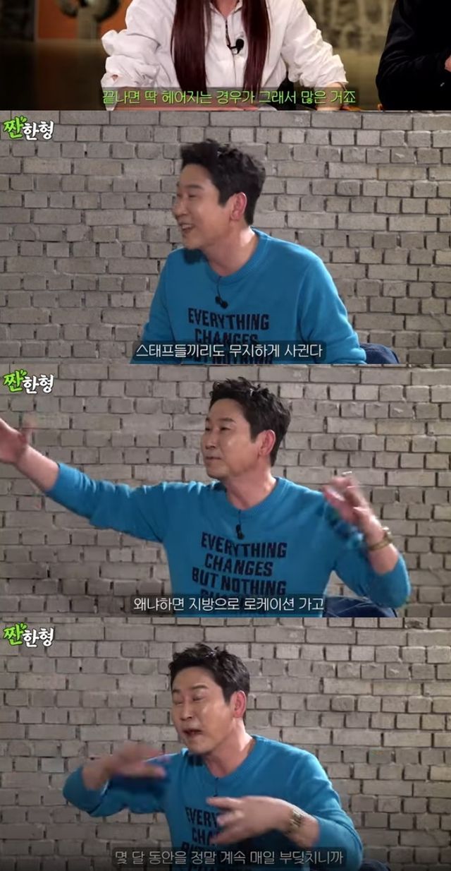 신동엽은 "드라마 찍을 떄 스태프들끼리 무지하게 많이 사귄다. 지방으로 로케이션 가고 몇 달 동안을 정말 계속 매일 부딪혀서 그렇다. 그러다가 드라마 끝나고 서로 또 다른 작품 가면 깔끔하게 끝난다"라며 너스레를 떨었다.