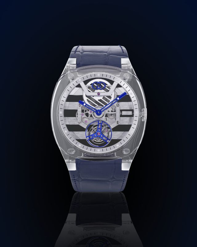 구찌 하이 워치메이킹의 상징인 투명 사파이어 글라스가 적용된 ‘GUCCI 25H 스켈레톤 뚜르비옹(GUCCI 25H Skeleton Tourbillon)’. 매우 섬세한 가공이 필요한 사파이어 글라스이지만 하우스의 기술력과 경험을 갖춘 장인들에 의해 8.2mm 두께의 아주 얇은 투명 사파이어 케이스가 탄생했습니다. 구찌 25H 스켈레톤 뚜르비옹 라인에서 블랙, 핑크, 블루 세 가지 색상의 프레셔스 레더 스트랩에 따라 동일한 색상의 인터로킹 G 로고가 핸즈 및 플라잉 뚜르비옹의 다이얼에 포인트로 적용되었습니다.
