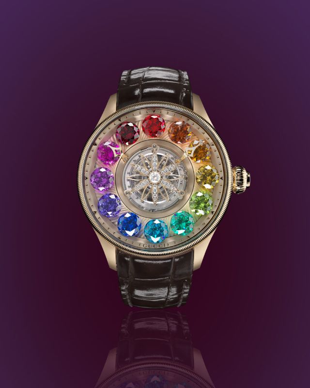무지갯빛을 선사하는 12개의 프레셔스 스톤이 세팅된 다이얼이 돋보이는 ‘G-타임리스 플래니태리엄(G-Timeless Planetarium)’. 파이어 오팔, 가넷, 베릴, 페리도트, 토르말린, 토파즈, 탄자나이트, 애미시스트, 루벨라이트 등 12개의 프레셔스 스톤이 반짝이는 댄싱 아워 플라잉 뚜르비옹을 원형으로 감싸며 독보적인 존재감을 드러냅니다. 크라운의 스타트 앤 스톱(start-and-stop) 기능을 통해 12개의 스톤이 회전하며, 각각의 스톤은 9초 동안 자체적으로 회전, 90초 동안 시계 방향으로 이동합니다. 40mm의 화이트 골드 또는 핑크 골드 소재로 만나볼 수 있으며, 각 컬러의 분침과 시침은 블루 또는 골드 컬러로 디자인돼 더욱 특별함을 더해줍니다.