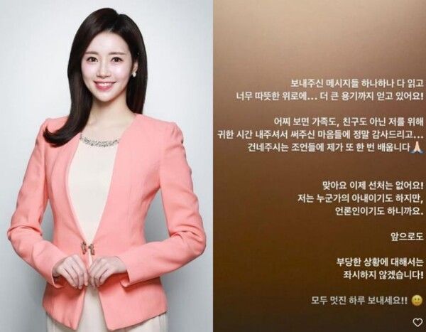 이은주는 악성 댓글에 대해 강경한 대응을 하겠다는 의지를 밝혔다. 그는 “맞아요. 이제 선처는 없어요”라며 “저는 누군가의 아내이기도 하지만 언론인이기도 하다. 앞으로도 부당한 상황에 대해 좌시하지 않겠다”라고 적었다.