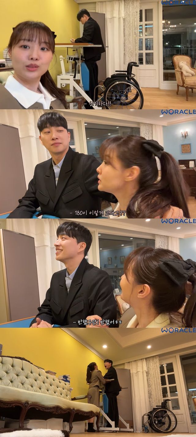 재활 기구를 이용해 일어선 박위에 송지은은 "신기하다 섰다"며 "오빠 키 진짜 크다. 나 옆에 가서 서보고싶어. 오빠랑 나랑 키 차이 진짜 많이 난다. 진짜 크다"며 감탄을 금치 못했다.