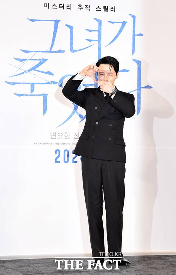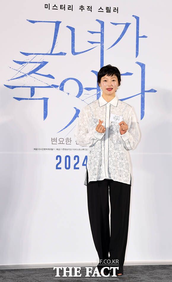 배우 변요한(왼쪽)이 17일 오전 서울 성동구 메가박스 성수에서 열린 영화 '그녀가 죽었다' 제작보고회에 참석해 영화에 대해 설명하며 앞서 자신이 출연한 영화 '한산'보다 자신있다고 발언하고 있다.
