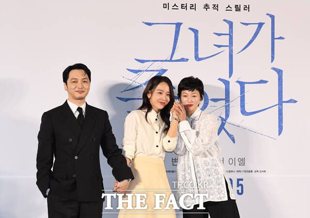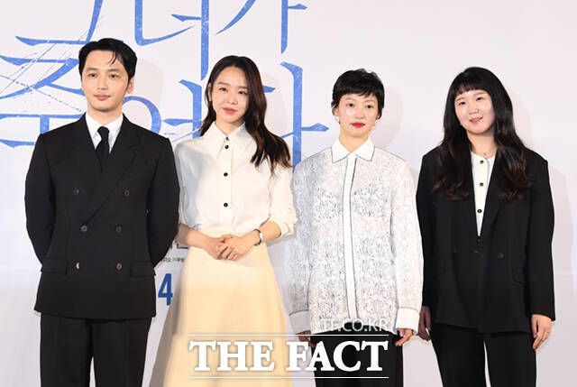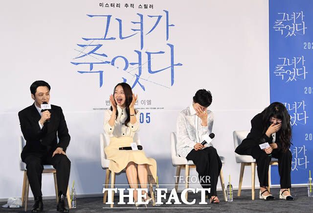 [더팩트ㅣ이새롬 기자] 배우 변요한과 신혜선, 이엘, 김세휘 감독(왼쪽부터)이 17일 오전 서울 성동구 메가박스 성수에서 열린 영화 '그녀가 죽었다' 제작보고회에 참석해 포즈를 취하고 있다.