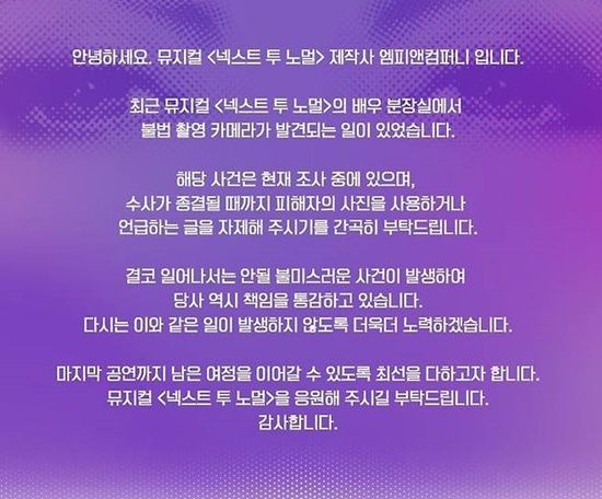 '넥스트 투 노멀'의 제작사 엠피앤컴퍼니는 공식 SNS를 통해 "최근 뮤지컬 '넥스트 투 노멀'의 배우 분장실에서 불법 촬영 카메라가 발견되는 일이 있었다. 해당 사건은 현재 조사 중이며, 수사가 종결될 때까지 피해자의 사진을 사용하거나 언급하는 글을 자제해주시기를 부탁한다"고 당부했다.