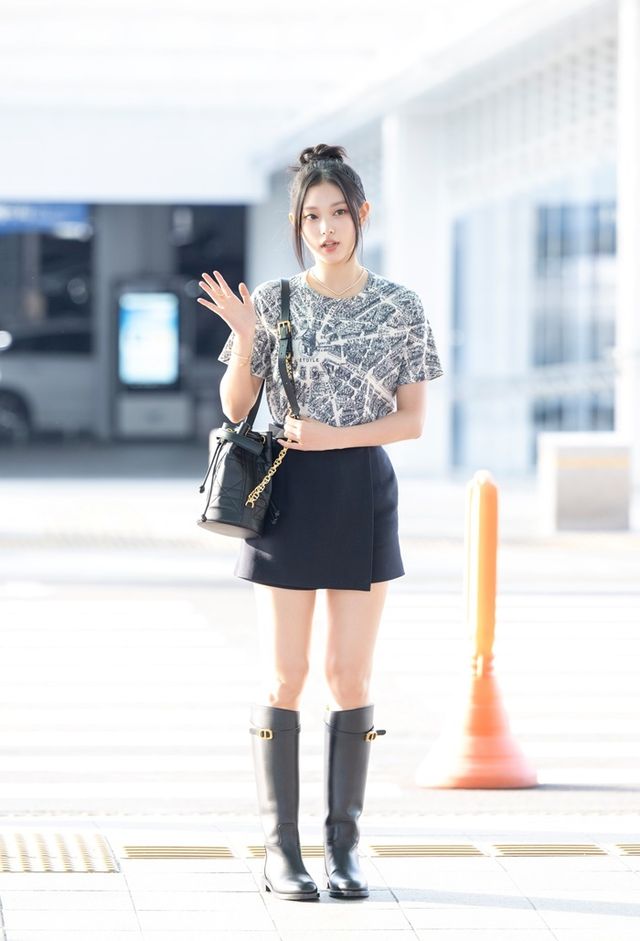 이날 해린은 블랙 컬러의 치마바지와 롱부츠, 백에 유니크한 패턴이 돋보이는 티셔츠의 시크한 스타일링을 완벽 소화했다.