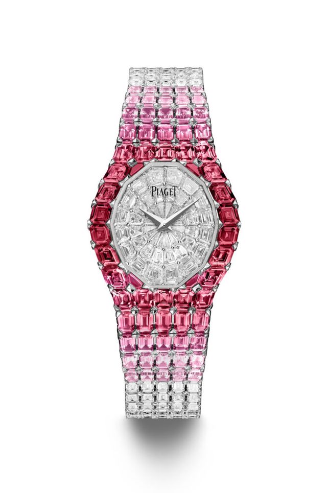 보자마자 시선을 사로잡는 커프 워치는 골드 체인 커프 위에 그린과 블루 컬러를 띄는 오팔 다이얼을 세팅했습니다. 비대칭 디자인의 금세공은 산호초를 연상시켜 다이얼 위에서 유기적으로 자라나는 듯한 모습을 연출했습니다. 네크리스나 벨트에 레이어드해 좌우로 흔들리는 시계의 움직임이 그네와 비슷해 붙여진 이름의 ‘스윙잉 쏘드와’는 세 가지 워치를 선보였습니다. 그중 말라카이트와 터콰이즈 비즈가 세팅된 네크리스는 수작업으로 완성한 골드 체인에 다이아몬드가 파베 세팅되어 화려한 분위기를 자아냅니다. 터콰이즈 다이얼이 탑재된 시계가 매달려 있으며 분리해 스트랩과 함께 착용이 가능하죠. 피아제가 ‘아우라 하이 주얼리’ 시계 출시 35주년을 기념해 루비, 핑크 사파이어, 다이아몬드가 세팅된 2가지 유니크 피스를 공개했습니다. 워치 전체에 파베 세팅된 바게트 컷 다이아몬드와 점점 레드 컬러로 이어지는 그러데이션이 매혹적인 분위기를 선사합니다.