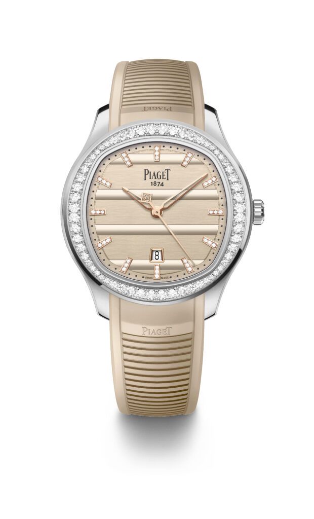 피아제가 2024 워치스앤원더스를 맞이해 피아제 폴로의 가드룬 디자인과 아이코닉한 피아제 폴로 데이트를 조합한 새로운 듀오 워치를 출시합니다. 하우스 시작 150주년 기념으로 선보이는 이번 ‘폴로 데이트’ 워치는 브라운 스트랩의 42mm 버전과 91개의 브릴리언트 컷 다이아몬드가 세팅된 베이지 스트랩의 36mm 버전까지 총 두 가지 디자인으로 완성했습니다. 300피스 한정으로 만나볼 수 있으며, 두 모델 모두 스틸 케이스에 로즈 골드 컬러의 핸즈를 장착하고 세컨즈 핸드에는 ‘150’이라는 문구가 새겨져 있어 더욱 특별함을 더했습니다.