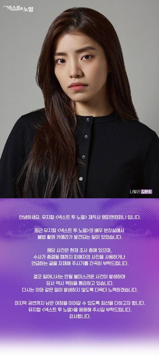 또한 뮤지컬 '넥스트 투 노멀' 제작사 엠피앤컴퍼니 측도 입장을 밝혔다. 엠피앤컴퍼니 측은 "최근 '넥스트 투 노멀'의 배우 분장실에서 불법 촬영 카메라가 발견되는 일이 있었다"며 "해당 사건은 현재 조사중에 있으며 수사가 종결될떄까지 피해자의 사진을 사용하거나 언급하는 글을 자제해주시기를 간곡히 부탁드린다"고 전했다.