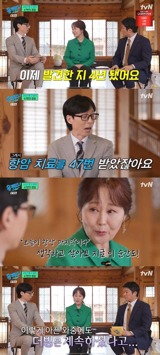 유재석은 "항암 치료가 정말 힘들다 그러시더라"라며 걱정했고, 강희선은 "힘들다. 그다음부터는 '오늘이 항상 마지막이다' 이러고 산다. 그 이후부터는"이라며 고백했다.