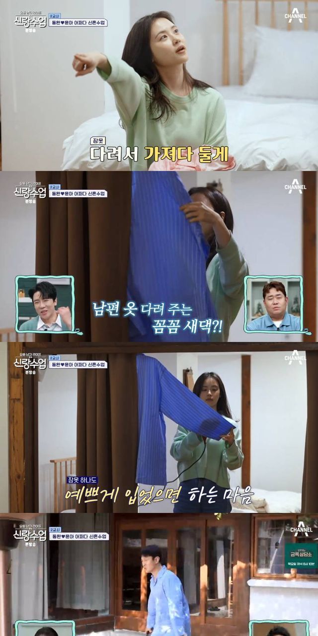 이어 "이거 다려서 여기다 둘게. 갔다 와"라고 말했다. 스튜디오에서 출연진들은 "신혼부부 느낌", "새 신부 느낌이다"라며 반응했다.