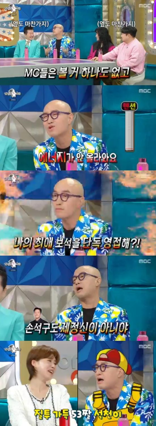 홍석천은 "배우, 모델, 글로벌 스타들이 출연할 때 나오면 얼마나 좋으냐. MC들 볼 거 하나도 없고, 내 양 옆(태진아, 강재준)에도 마찬가지다. 오늘은 에너지가 정말 안 올라온다"고 속마음을 말했다.