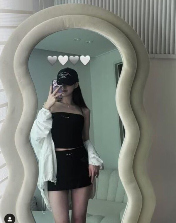 사진 속 율희는 검은 튜브톱과 미니 스커트를 입고 시크한 매력을 발산하고 있다.