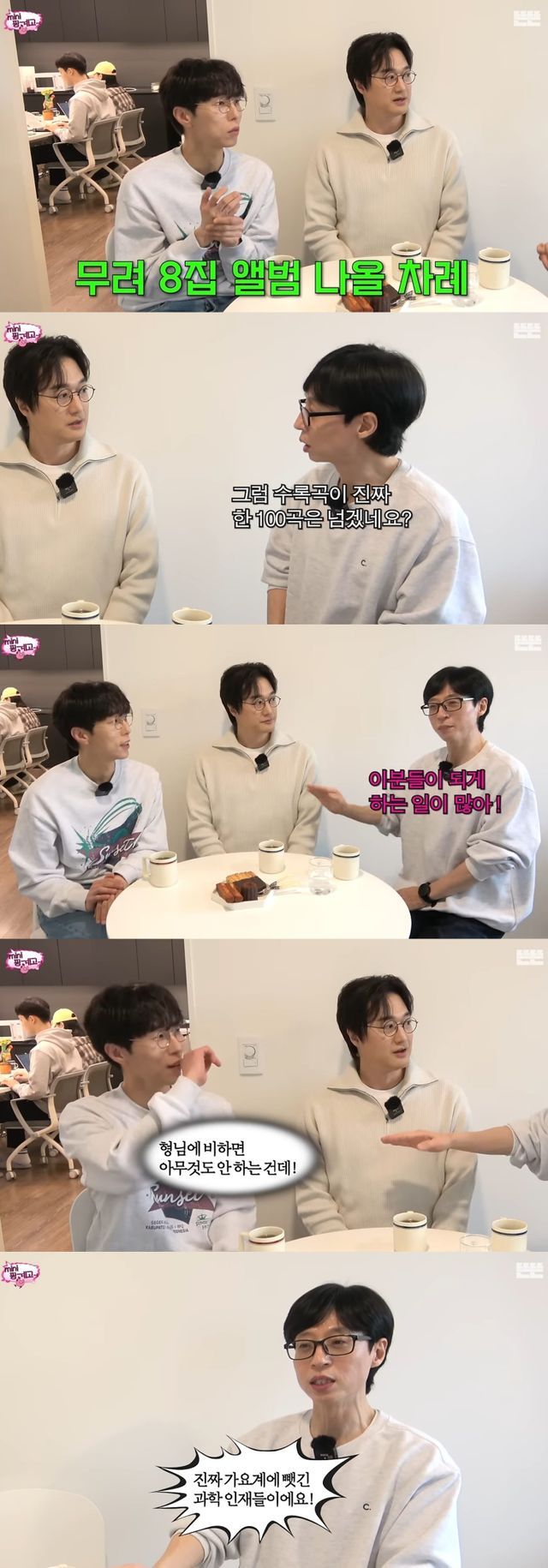두 사람이 8집 앨범을 준비 중이라고 밝히자 유재석은 놀라며 "수록곡이 100곡은 넘겠네요?"라고 질문했다.